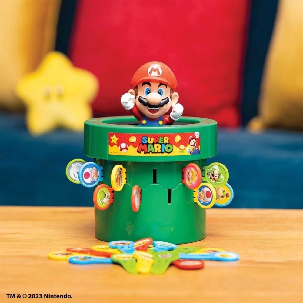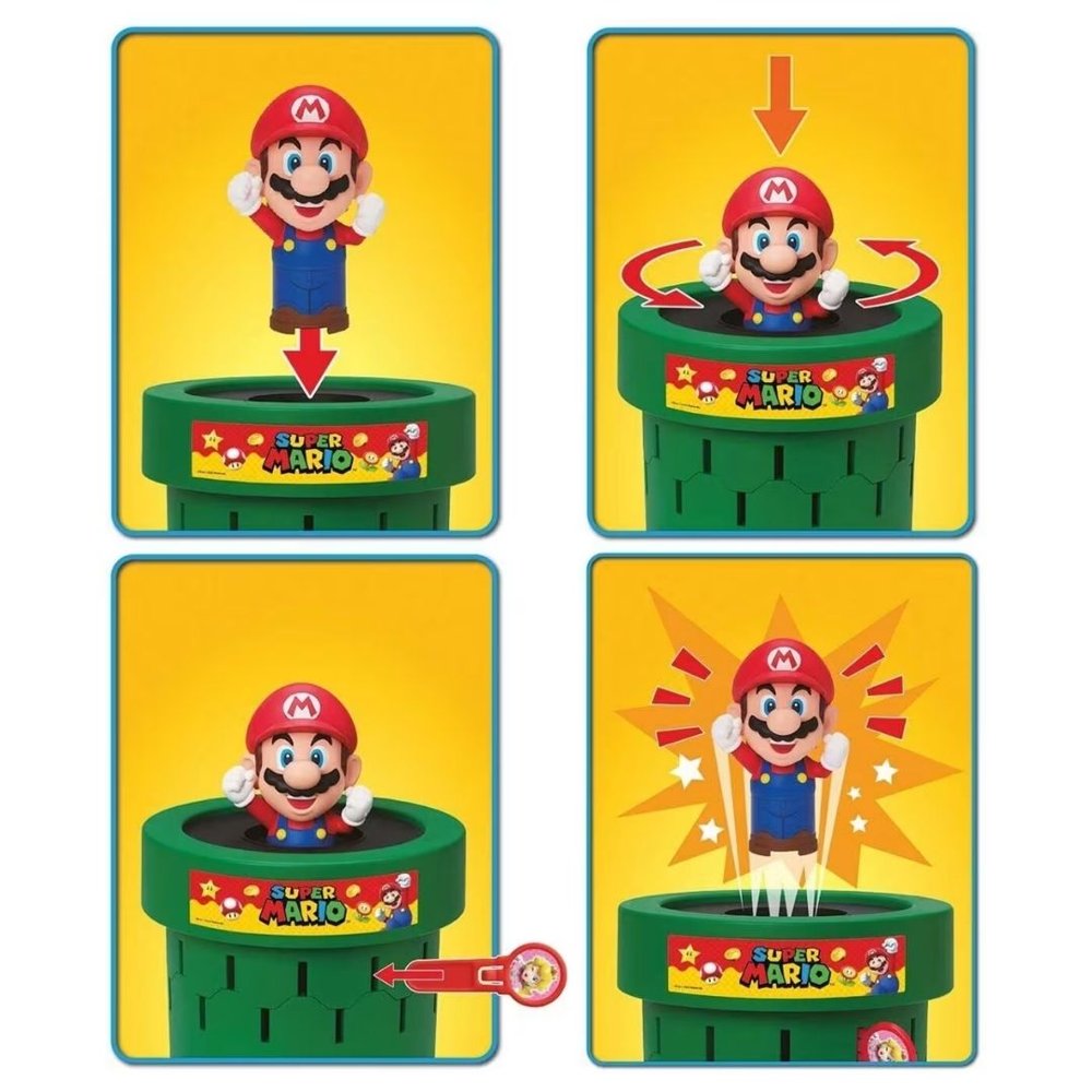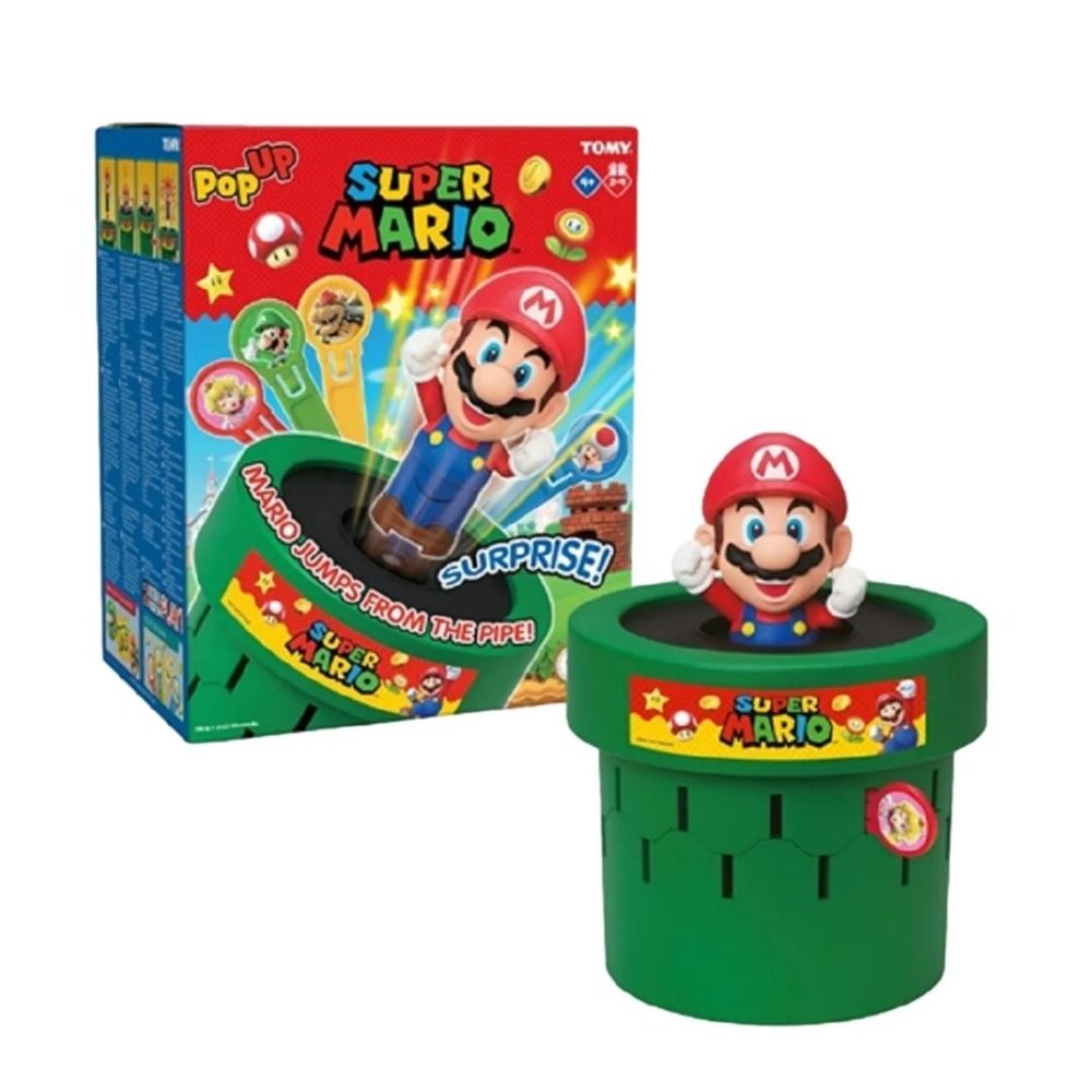 חובבי סופר מריו, צעירים ומבוגרים כאחד, יאהבו את המשחק החדש של המותג TOMY. ניתן לשחק במשחק בשלוש דרכים שונות: קלאסי, איסוף מטבעות ומשחק קבוצתי. במשחק הקלאסי, מריו נמצא בתוך הצינור שלו ועליכם לעזור לו לצאת. כל שחקן בתורו מחליק משוטים לתוך הצינור. כאשר נבחר החריץ הנכון… פופ! מריו יקפוץ החוצה מהצינור והשחקן הזה ינצח במשחק. אף אחד לא יודע איזה חריץ יגרום לו לצוץ בפעם הבאה – זה שונה בכל פעם! למשחק ארוך יותר, נסו את משחק איסוף המטבעות. בגרסה זו, המשוטים מעורבבים ומונחים כשצד המטבעות כלפי מטה. כל שחקן בוחר משוט חדש בתחילת תורו. השחקן שעוזר למריו לצאת סופר את מספר המטבעות על המשוט הזה ומקבל את זה נוסף לניקוד שלו. המשיכו לשחק. לכל משוט יש מספר שונה של מטבעות, והשחקן עם הכי הרבה מטבעות בסוף מנצח! משחק קבוצתי מושלם לקבוצות גדולות יותר, כאשר צוות לואיג’י משחק נגד צוות באוזר. הצוות שעוזר למריו לצאת מהצינור מנצח באותו סיבוב. אתם יכולים לבחור לשחק כצוות באמצעות הגרסה הקלאסית או גרסת איסוף המטבעות של המשחק. המשחק מתאים ל-2 עד 4 שחקנים או קבוצות. גילאי: 4+ / מידות: 26.67X21.59X15.24 ס”מ